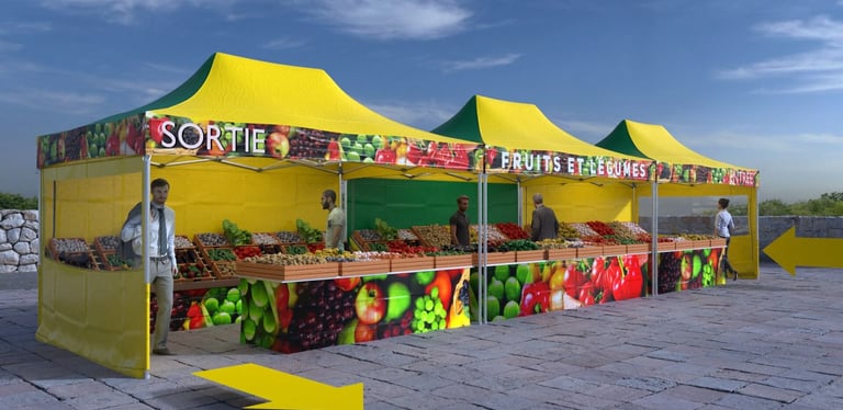 LPTENT fertigt eine Vielzahl an Zubehör und Optionen, um Ihnen größtmögliche Freiheit in Ihrem mobilen Geschäft zu bieten: individuell bedruckte Markt-Faltpavillons für Obst und Gemüse, Marktzelt-Verkleidungen und Vordächer zur Erweiterung Ihrer überdachten Fläche, Arbeitsbänke in Industriequalität, Roll-up-Banner... Alles für den perfekten Pop-up-Marktstand!