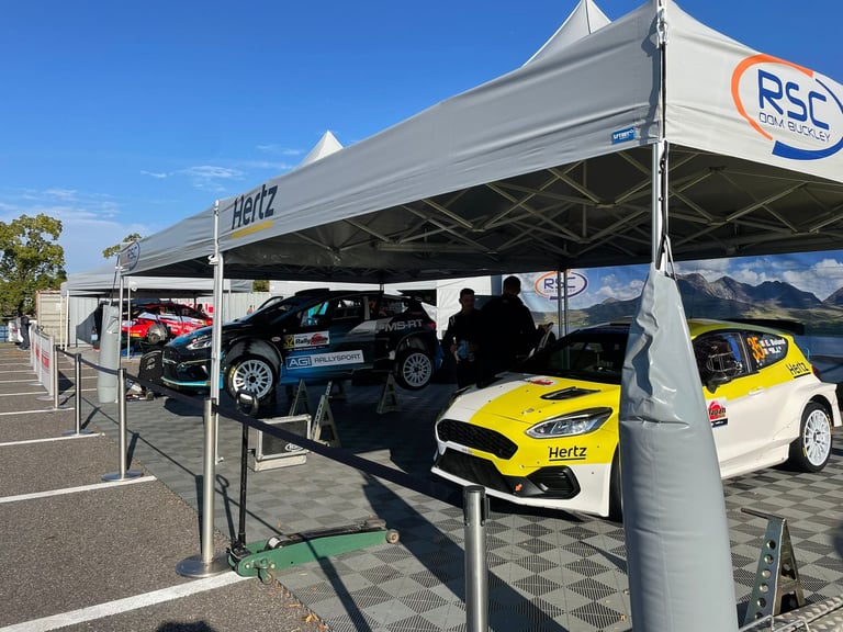 Rallye-Paddock mit 3x3m Faltpavillon & sechseckigem Servicezelt